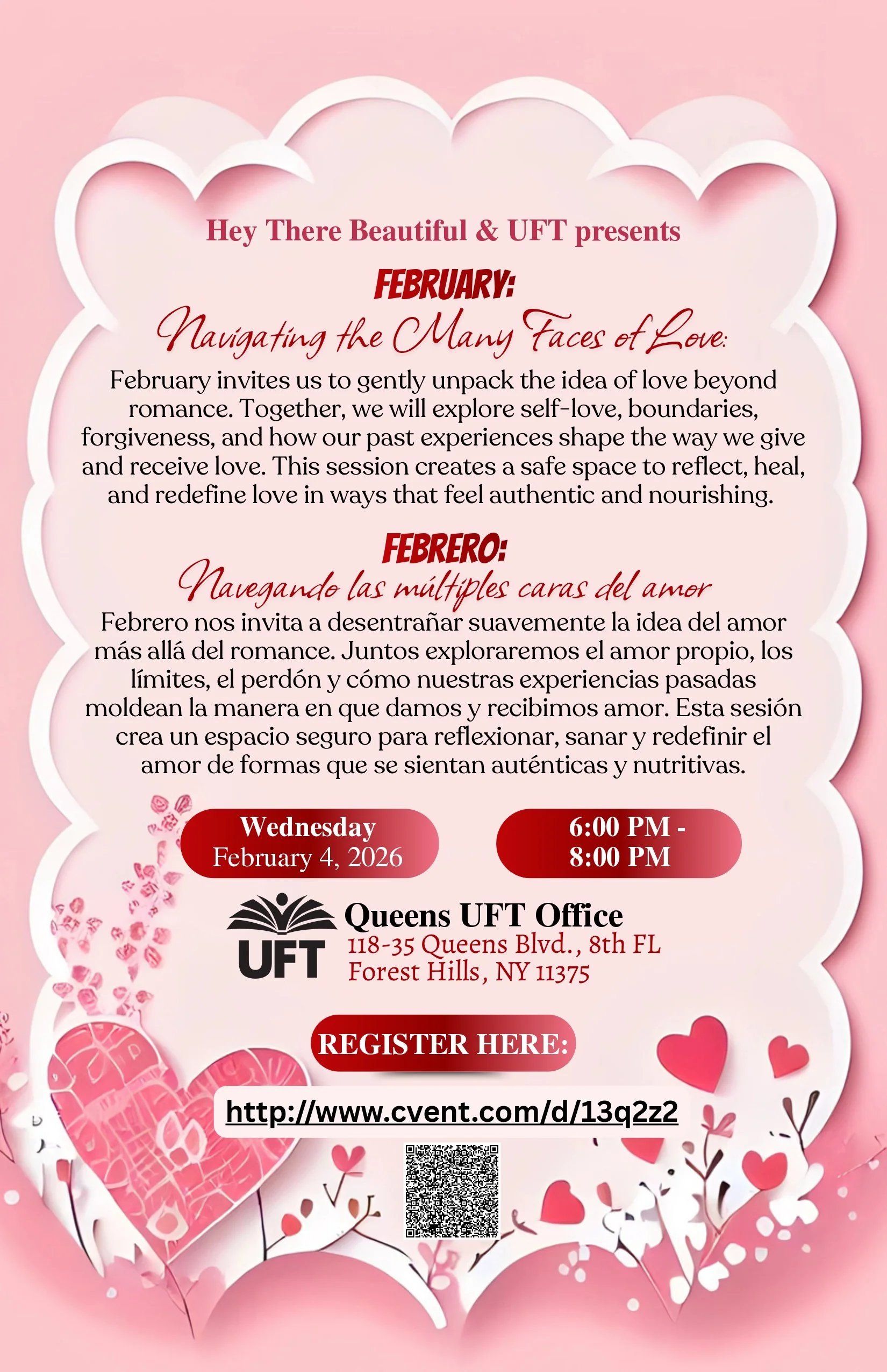 Join HTB in Queens this February for Navigating the Many Faces of Love! The month of February invites us to gently unpack the idea of love beyond romance. Together, we will explore self-love, boundaries, forgiveness, and how our past experiences shape the way we give and receive love. This session creates a safe space to reflect, heal, and redefine love in ways that feel authentic and nourishing.